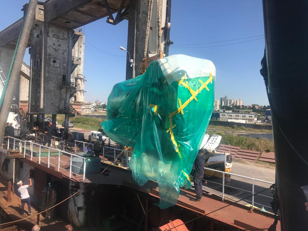 Con anterioridad ya se había bajado el generador de punta de eje y la caja, y ahora, con maniobras que requirieron la intervención de más de una veintena de operarios en los trabajos, finalmente fue el turno de la planta propulsora. La maniobra fue planificada durante tiempo, y puesta en marcha dos días previos, para subir a un trailer especial -por lo bajo- el motor de 3.70mts de altura, que pudo ingresar justo por centímetros a la altura del ingreso a la TC2. La operación parece simple, pero en la práctica y debido a la estructura de los silos y la altura de la pluma de la grúa que levantaría el motor, se debió modificar por algunos metros, el lugar de atraque -mas a popa- del BP Luca Mario, para ello, el personal de muelle liderado por el capitán de armamento de la empresa, debió correr 12 buques, entre los que se encuentran pesos pesados como el BP Beagle I a popa y varios poteros, más los tradicionales inactivos que no cuentan con personal a bordo, ni con cabos de amarre en condiciones.