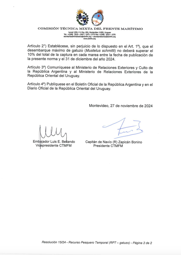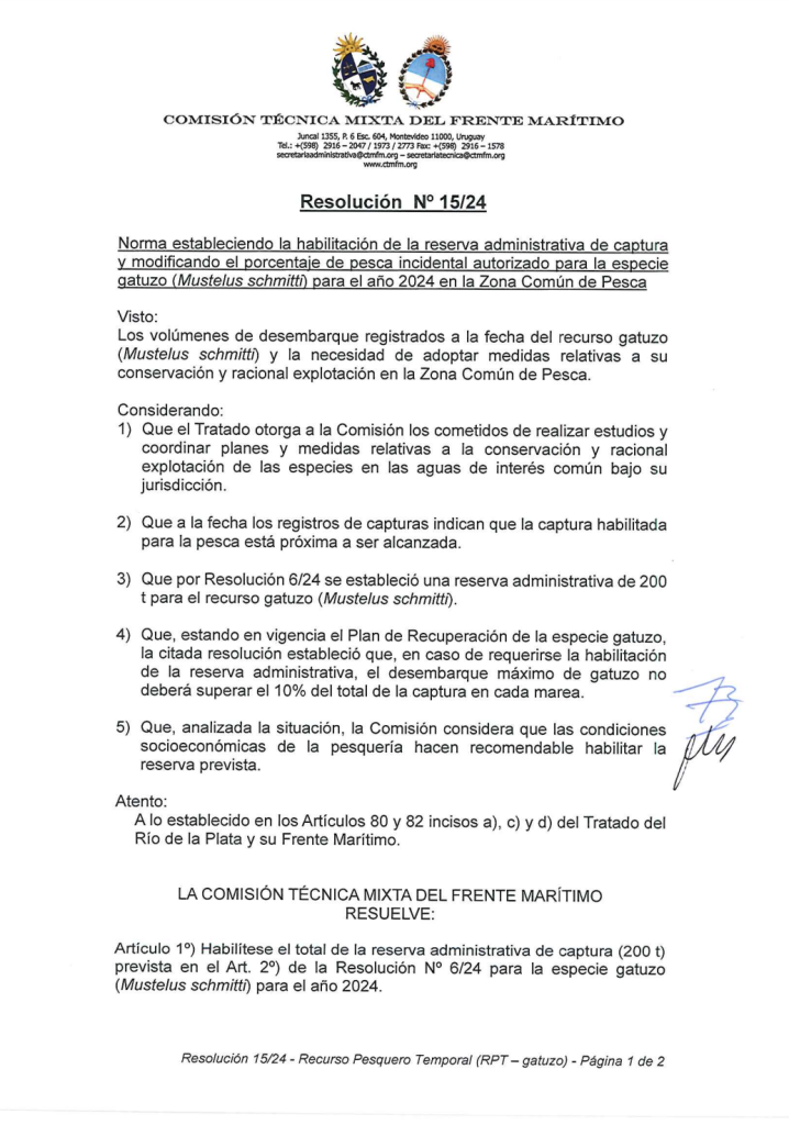 La Comisión Técnica Mixta del Frente Marítimo (CTMFM) ha emitido la Resolución CTMFM Nro.15/2024, que fuere publicada en el Boletín Oficial hace algunas horas, en la cual se establece la habilitación de la reserva administrativa de captura de la especie gatuzo (mutelus schmitti ) y se modifica el porcentaje de pesca incidental permitido para este recurso en la Zona Común de Pesca (ZCP) durante el año 2024.