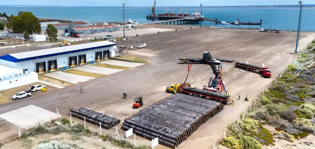 Las tuber铆as descargadas se utilizar谩n en tramos terrestres y submarinos del gasoducto de aproximadamente 15 kil贸metros, que unir谩 el Gasoducto San Mart铆n (red troncal proveniente del sur) con el sistema mar铆timo del proyecto a la altura de Fuerte Argentino, donde se proyecta el montaje de las unidades flotantes de licuefacci贸n (FLNG). Ese enlace permitir谩 transportar gas desde la red existente hasta la unidad flotante y, desde all铆, transformarlo en Gas Natural Licuado para su colocaci贸n en el mercado internacional.