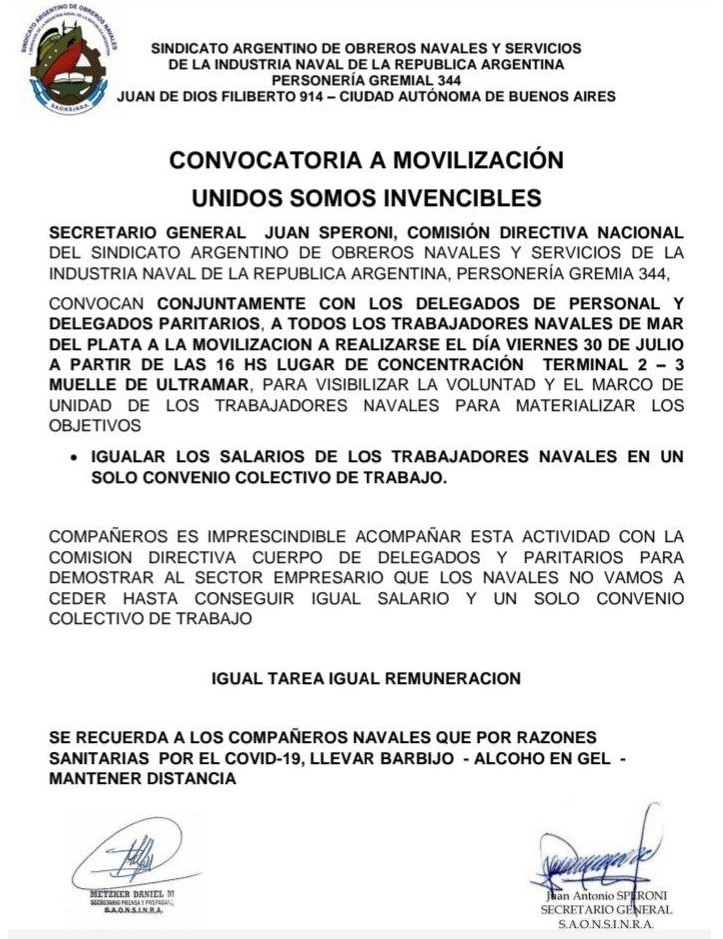 El próximo viernes 30 de julio, el SAON convocó bajo el lema “Unidos somos invencibles” a delegados de personal y delegados paritarios como a todos los participantes de la industria naval marplatense , a una movilización en la puerta de la TC2 y TC3 del puerto de nuestra ciudad.