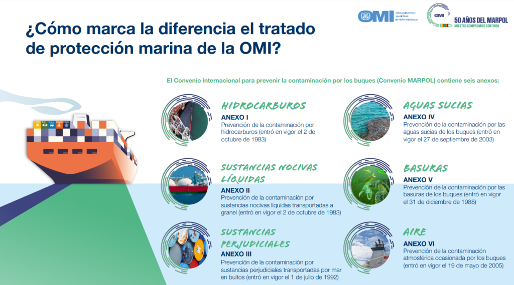 «50 años del MARPOL: nuestro compromiso continúa»pone de relieve el Convenio internacional para prevenir la contaminación por los buques (Convenio MARPOL) sobre la prevención de la contaminación del medio marino por los buques, ya sea por causas operacionales o accidentales.
