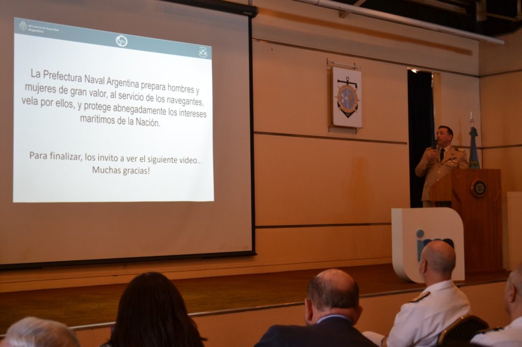 Asimismo destacó el rol que se cumple en el control de la Zona Económica Exclusiva Argentina, la compleja problemática de los actores internos y externos y el abordaje integral de los temas, concluyendo la proyección de un video donde se mostró de que manera actúa la Fuerza en altamar ante la presencia de embarcaciones que pueden estar cometiendo un ilícito.