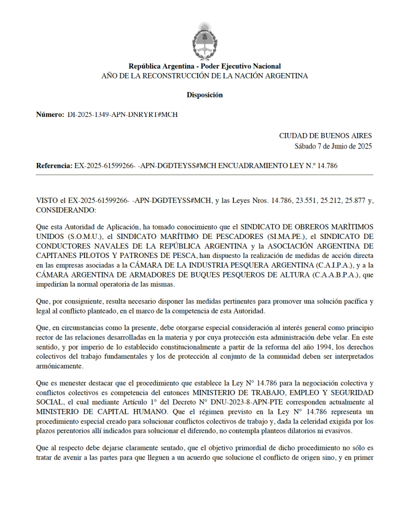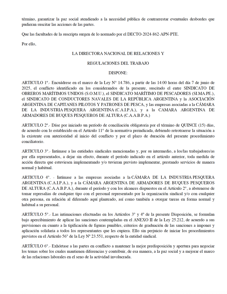 El Ministerio de Capital Humano, a través de la Dirección Nacional de Relaciones y Regulaciones del Trabajo, dictó este sábado una medida de conciliación obligatoria que alcanza al conflicto entre los gremios marítimos y las cámaras empresarias del sector fresquero de altura.
