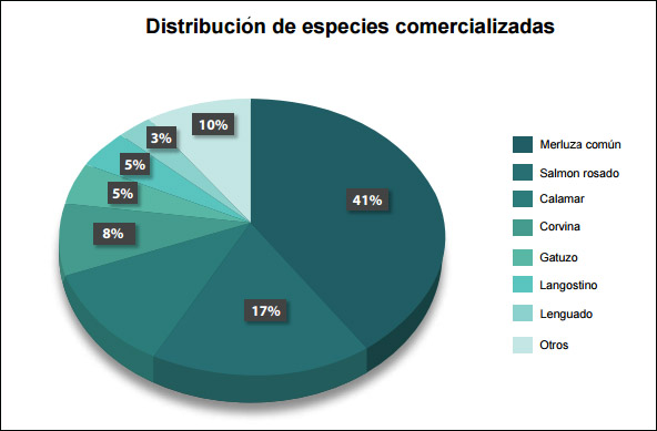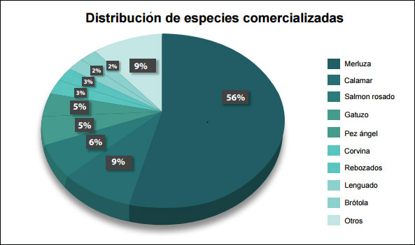 Las especies con mayor demanda son: merluza (entera y filet), calamar (entero, anillas y aleta), salmón rosado (entero y filet), gatuzo (entero y filet), pez ángel, (entero), corvina (entera), rebozados (generalmente de merluza), brótola (filet) y lenguado (filet).