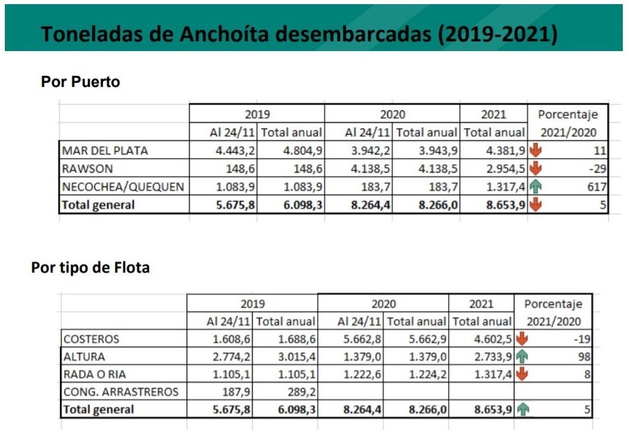La presentación consto de 4 partes bien identificadas que tuvieron que ver con la información técnica y comparativa de la pesquería con relación a los dos últimos años, donde quedó claro el impacto de las descargas en el marco del COVID-19, pero fundamentalmente en la participación de Chubut en la pesquería de anchoíta en el 2020, donde por primera vez en la historia, un puerto distinto a Mar del Plata toma la delantera en cuanto a descargas de esa especie.
