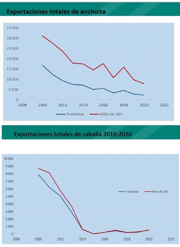 Entre las ilustraciones presentadas en las siguientes exposiciones, se destacan que desde el año 2012 la caída en descargas es abrupta y que ambas especies, vienen en caída libre en cuanto a las capturas de las mismas.