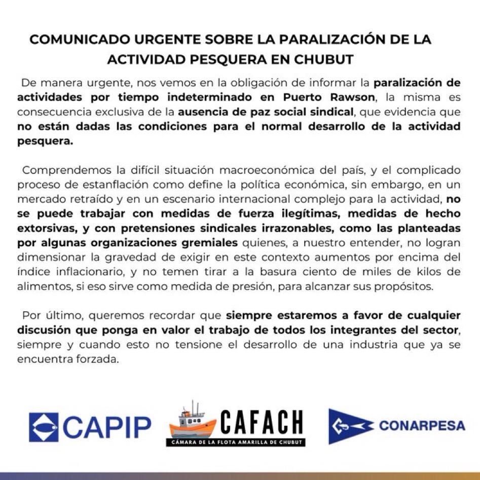 “De manera urgente, nos vemos en la obligación de informar la paralización de actividades por tiempo indeterminado en Puerto Rawson, la misma es consecuencia exclusiva de la ausencia de paz social sindical, que evidencia que no están dadas las condiciones para el normal desarrollo de la actividad pesquera”.