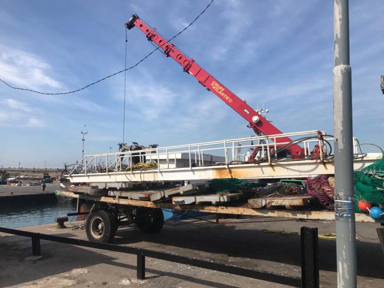 Mientras personal a bordo iba desarticulando la cinta de lavado de langostino en cubierta, la pluma lentamente iba retirando artes de pesca, portones y redes tangoneras.