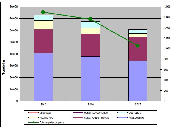 Los desembarques alcanzaron hasta el pasado 30 de abril unas 60.424 toneladas, unas 6.949 toneladas menos respecto al mismo período de 2014. La caída fue de 10 puntos medida en términos porcentuales.
