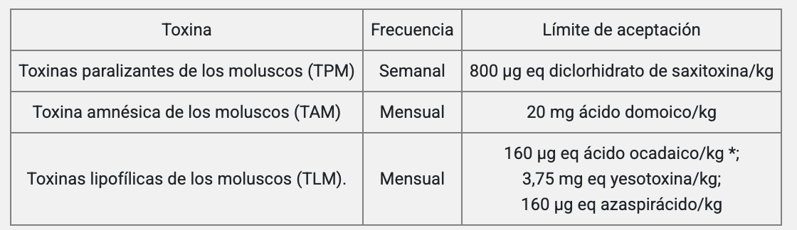 Según la disposición, las toxinas paralizantes deberán analizarse semanalmente, con un límite máximo de 800 microgramos por kilo, mientras que las toxinas amnésicas y lipofílicas serán controladas mensualmente, con topes de 20 miligramos de ácido domoico y 160 microgramos de ácido ocadaico por kilo, respectivamente.