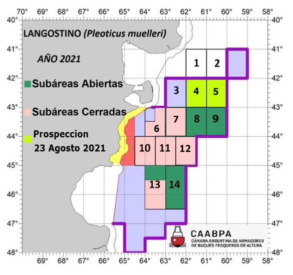 - Subárea 5: entre 42°00’ y 43°00’ S y entre 60°00’ y 61°00’ W.