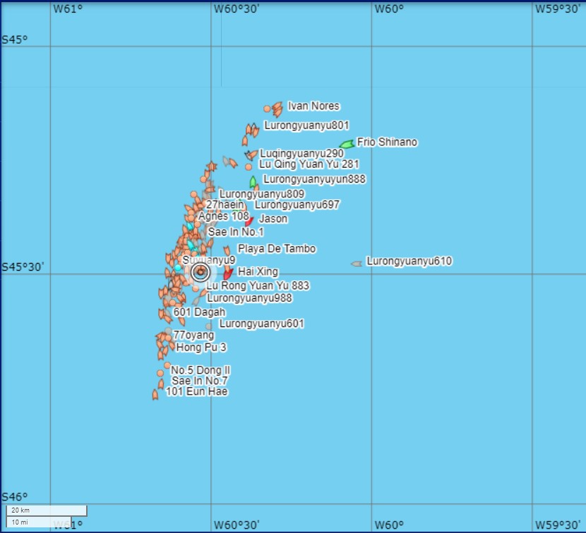 También en la misma posición de esa flota extranjera, se encuentran varios Reefers que son los buques encargados de cargar el calamar illex capturado por la flota china y coreana, entre ellos se destacan el Frio Shinano, Ningtailengs5, Scout -ahora en Malvinas-.