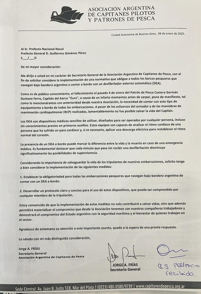 El Secretario General de la Asociación Argentina de Capitanes de Pesca, Jorge A. Frías, presentó en el día de ayer, una solicitud al Prefecto Nacional Naval, Prefecto General Dr. Guillermo Giménez Pérez, instando a la implementación de una normativa que obligue a todos los buques pesqueros de bandera argentina a contar con un Desfibrilador Externo Automático (DEA) a bordo.