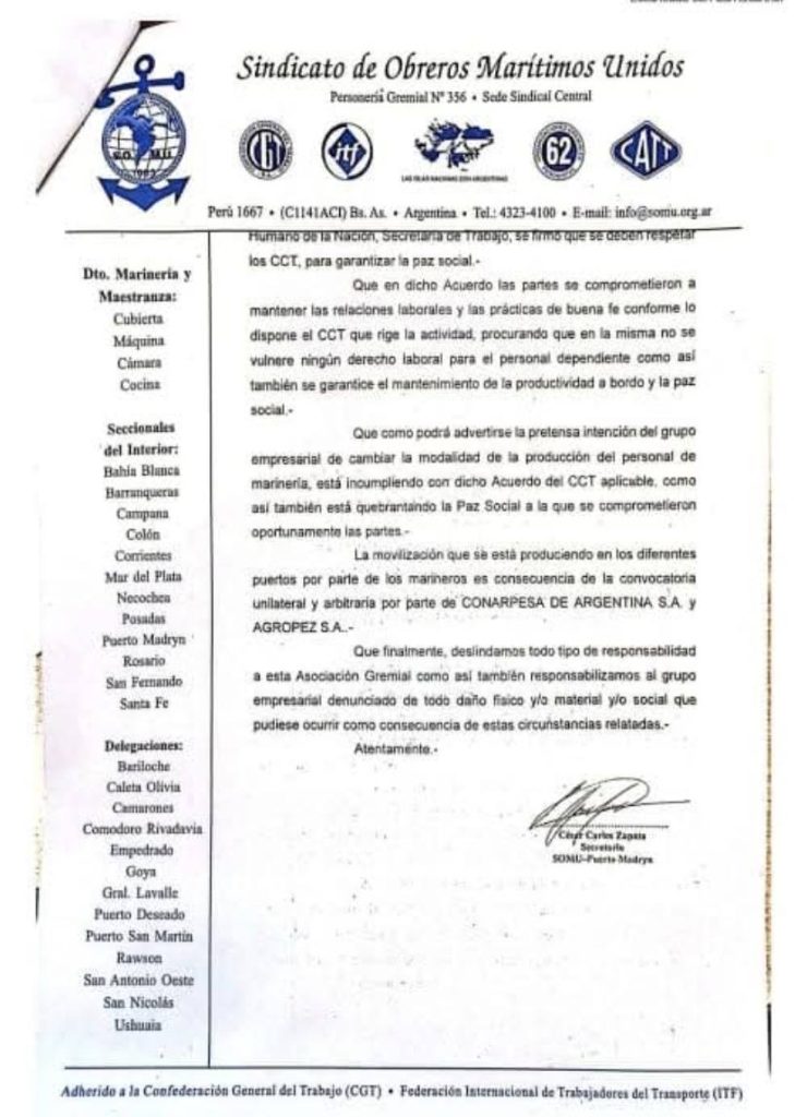 Además, el sindicato deslindó toda responsabilidad por las movilizaciones de marineros que, según afirmaron, se están produciendo en distintos puertos de la provincia de Chubut como consecuencia de “la convocatoria unilateral y arbitraria” de las empresas.