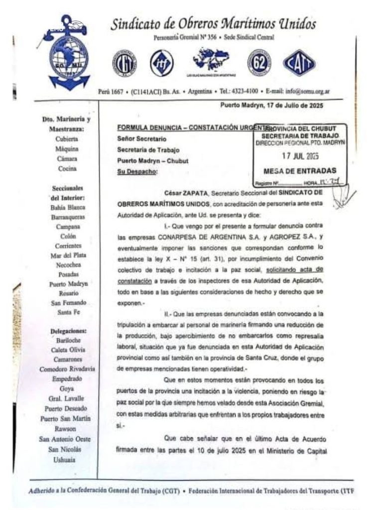 El Sindicato de Obreros Marítimos Unidos (SOMU), seccional Puerto Madryn, presentó el 17 de julio una denuncia formal ante la Secretaría de Trabajo local contra las empresas Conarpesa de Argentina SA y Agropez SA, por presuntas prácticas laborales irregulares y “provocar un clima de violencia que pone en riesgo la paz social en los puertos de la provincia”.