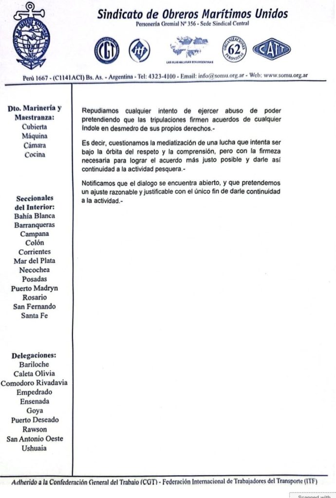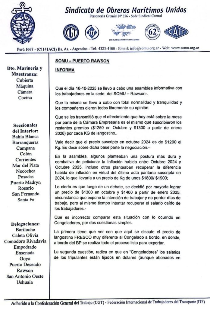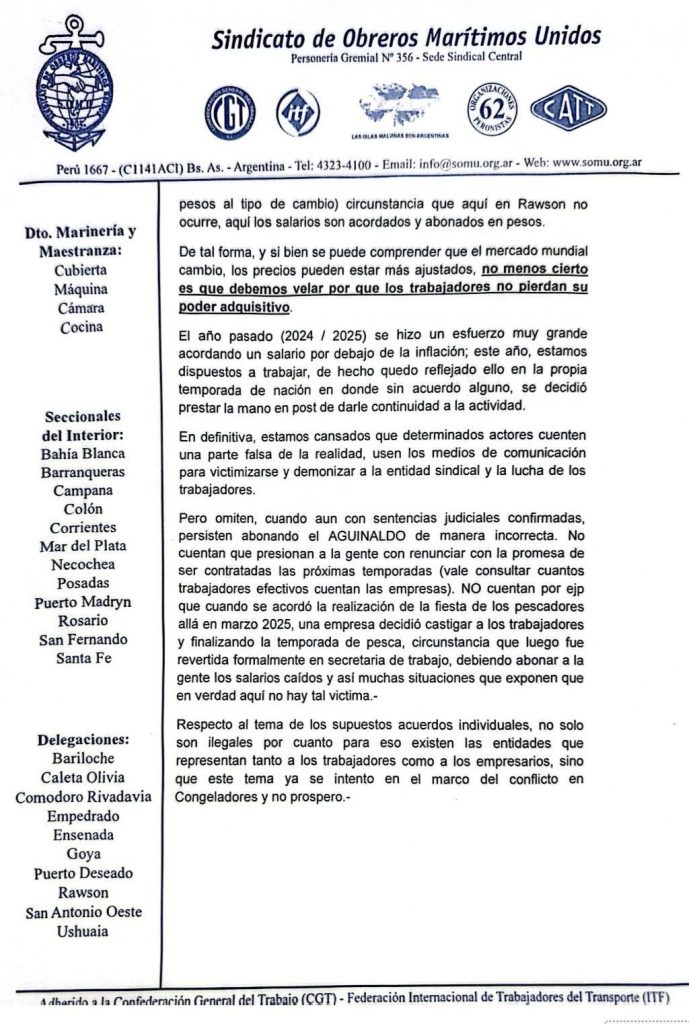 La conducción del SOMU Rawson repudió cualquier intento de firmar acuerdos individuales con las tripulaciones, al considerar que son ilegales y vulneran la representación sindical. “Estos mecanismos ya se intentaron en el conflicto de los congeladores y no prosperaron”, recordaron.