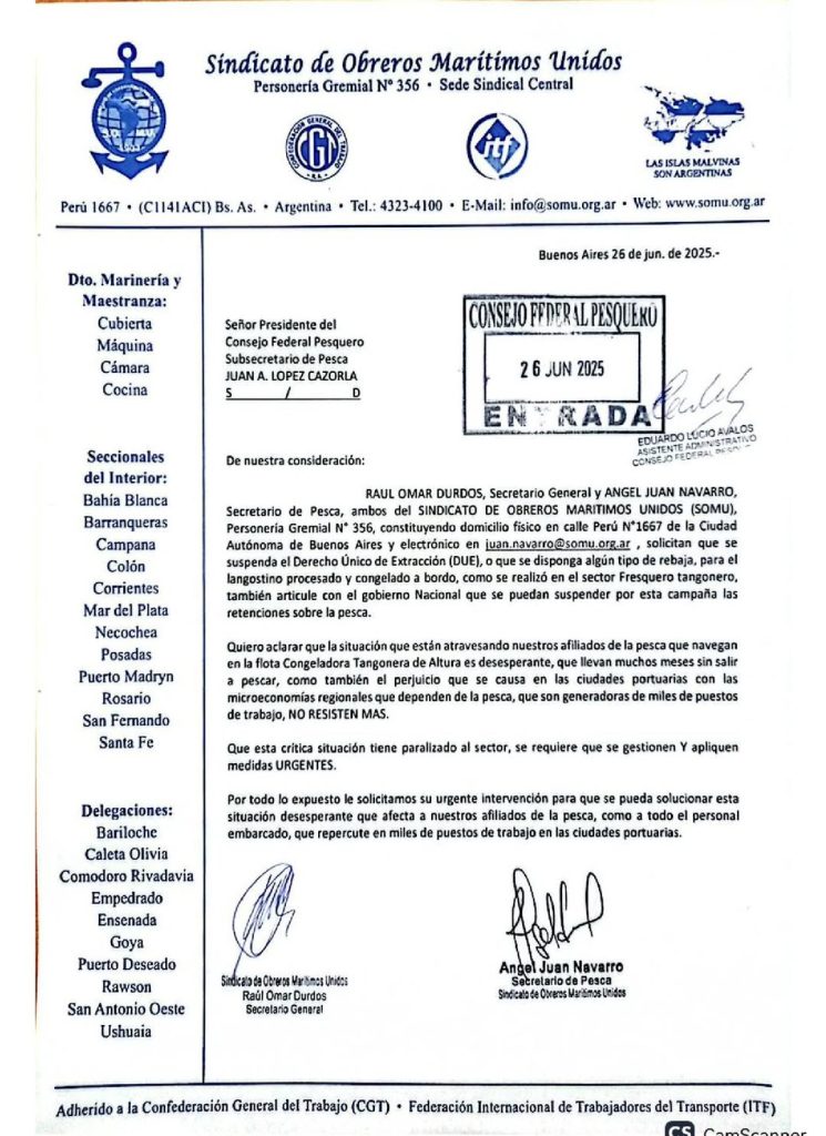 El Sindicato de Obreros Mar铆timos Unidos (SOMU) solicit贸 formalmente al Consejo Federal Pesquero (CFP) la suspensi贸n o reducci贸n del Derecho 脷nico de Extracci贸n (DUE) aplicado al langostino procesado y congelado a bordo, al igual que lo resuelto previamente para la flota fresquera tangonera. La nota fue presentada por el secretario general del gremio, Ra煤l Durdos, y el secretario de pesca, 脕ngel Juan Navarro y tiene fecha de ingreso por entrada el d铆a 26 de junio 2025.