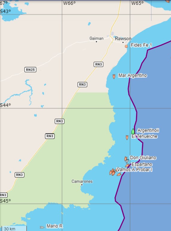 En la zona estuvo el Bogavante Segundo prospectando en aguas linderas y aledañas a Chubut, y en este momento el BIP Mar Argentino, de paso por la zona, con destino al Golfo San Jorge, para dar inicio a una campaña de ambiente costero, fondos y oceanografía en la zona.