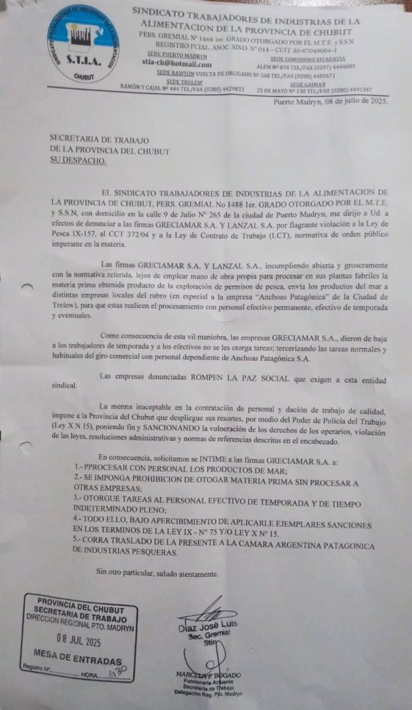 El Sindicato de Trabajadores de la Industria de la Alimentación (STIA) denunció a las firmas Greciamar S.A. y Lanzal S.A. por violar abiertamente la normativa laboral y pesquera vigente, tras conocerse que ambas empresas derivaron materia prima a otra planta del sector en la ciudad de Trelew, mientras su personal permanece sin tareas asignadas.