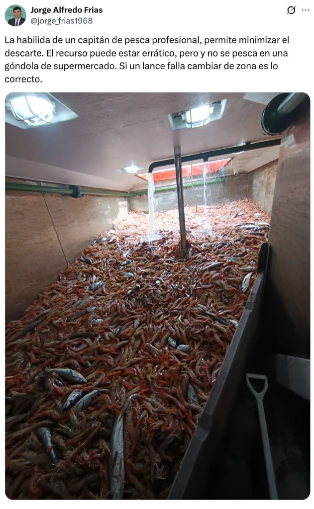 En sentido contrapuesto, y en defensa del gremio que representa, se expresó a través de su cuenta X el titular de la Asociación de Capitanes, Cap Jorge FrÃas, quien publicó una imagen con una reflexión que insta a mejorar la calidad de capturas, destacando la posibilidad que tienen los buenos capitanes de buscar el recurso con umbrales de captura incidental por debajo de los lÃmites máximos considerados por la Res.CFP Nro.7/2018 Anexo I, con un llamado de atención hacia los participantes del caladero.