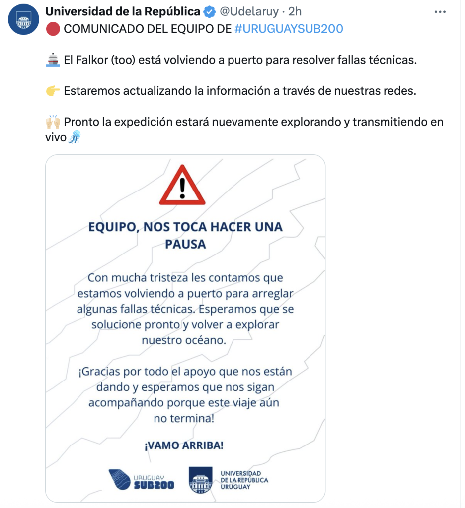“Equipo, nos toca hacer una pausa”, fue el mensaje con el que la Universidad de la República (Udelar) informó la novedad en redes sociales, captando rápidamente la atención del público y generando cientos de reacciones. El navío, que transporta a 37 investigadores, biólogos y personal de ciencias, exploraba a 187 millas náuticas al SE de Montevideo y a 145 millas náuticas al Este de Villa Gesell, cuando se detectó el inconveniente y puso proa a Montevideo a las 16:05 horas.