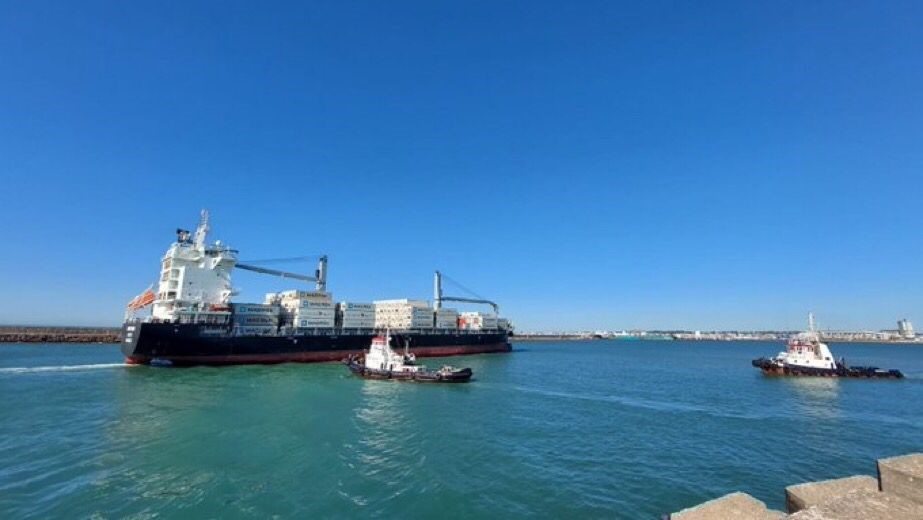 Con su ingreso, el puerto local comienza a recuperar capacidad exportadora. De aqu铆 se llevar谩 setenta contenedores con pescado rumbo Brasil. Regresar谩 cada diez d铆as.