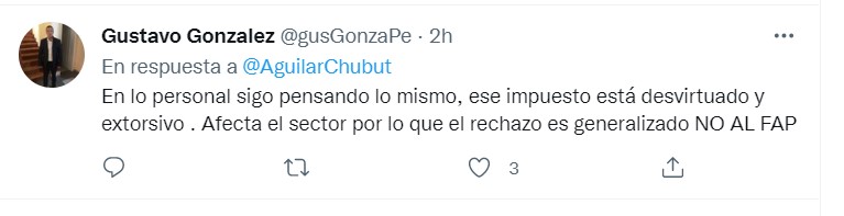 Ayer, cerca de las 22hs, el mismo Gustavo González, responde en el mismo hilo del Secretario de Pesca Dr. José Gabriel Aguilar diciendo » en lo personal, sigo pensando lo mismo, ese impuesto está desvirtuado y extorsivo. Afecta el sector por lo que el rechazo es generalizado NO AL FAP » sic.