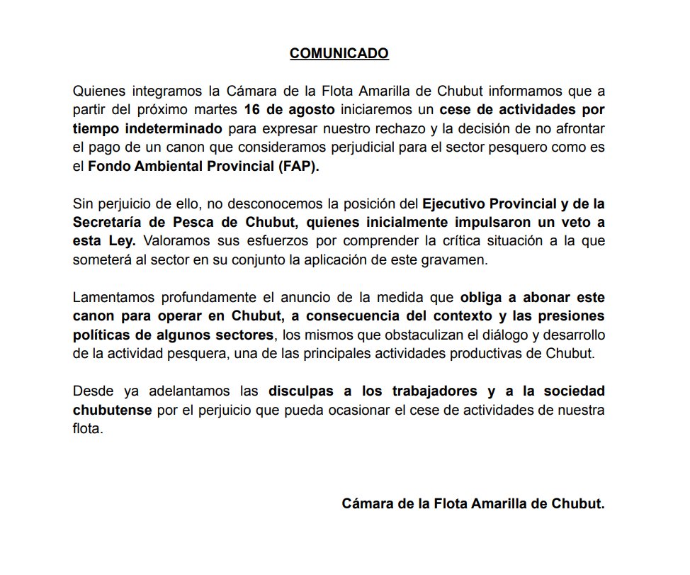 También la Cámara de la Flota Amarilla de Chubut mostró disconformidad ante la embestida del cobro del FAP a toda buque que descargue en Rawson, Puerto Madryn y Bahía Camarones. De continuar con la iniciativa, a partir del mismo momento de la aplicación del FAP, la flota se declara en CESACION DE ACTIVIDADES.