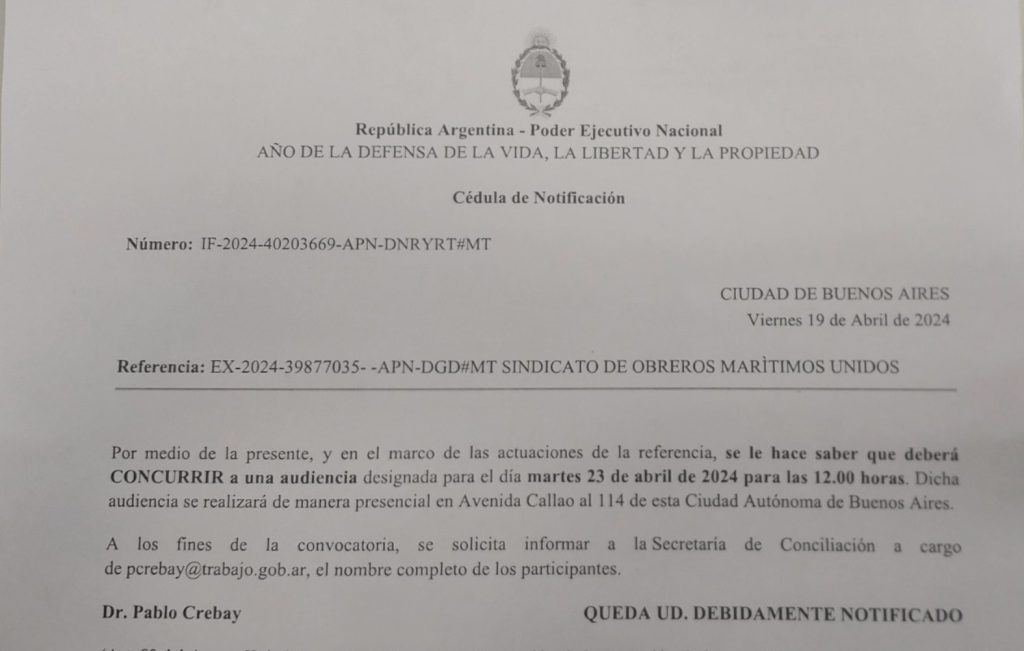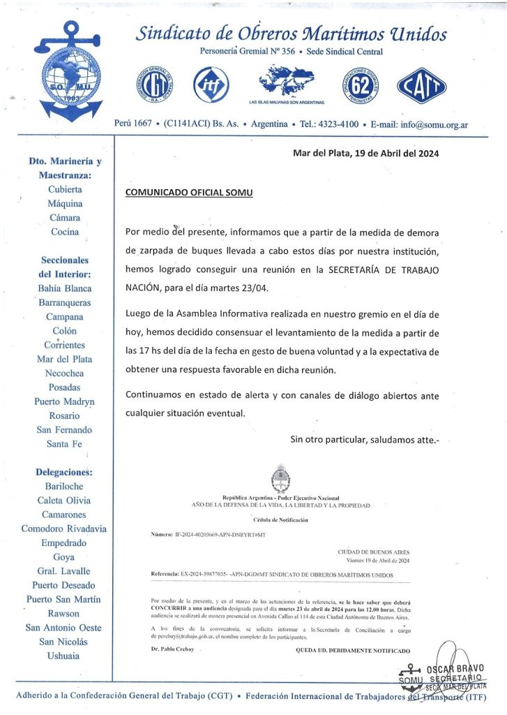 El SOMU, ayer, una vez notificado por el Ministerio de Trabajo, informó mediante una misiva a todo su personal, que se levantaban las demoras en las zarpadas ad referéndum de la convocatoria para el próximo martes 23 de abril próximo a las 12hs donde en una nueva reunión, formal en este caso, los Dres.Diego García Luchetti y Fernando Rivera se verán con los representantes del SOMU delegación Mar del Plata, Oscar Bravo y Damián Basail.