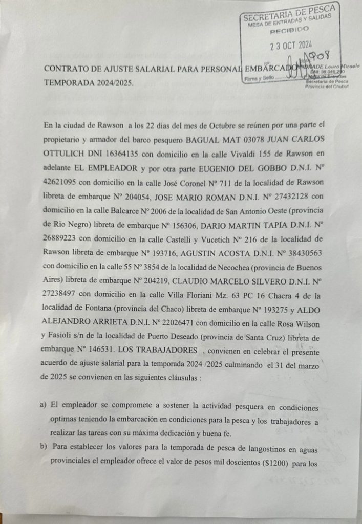 Con motivo de la firma de un contrato con fecha 22 de octubre y presentado ayer, realizado en Rawson acerca de un ajuste salarial para trabajadores embarcados entre el armador del BP Bagual, el histórico capitán, Juan Carlos Ottulich y un grupo de trabajadores, ha desatado un fuerte malestar entre la dirigencia de la marinería nucleada en el SOMU de la provincia de Chubut. Los trabajadores, que han estado luchando durante meses por el cumplimiento de un acta acuerdo firmada en octubre 2023, ven este nuevo contrato, -según lo sugerido en redes sociales durante todo el dia de ayer-, como “ilegal ” y en contraposición con el convenio colectivo que garantiza sus derechos.
