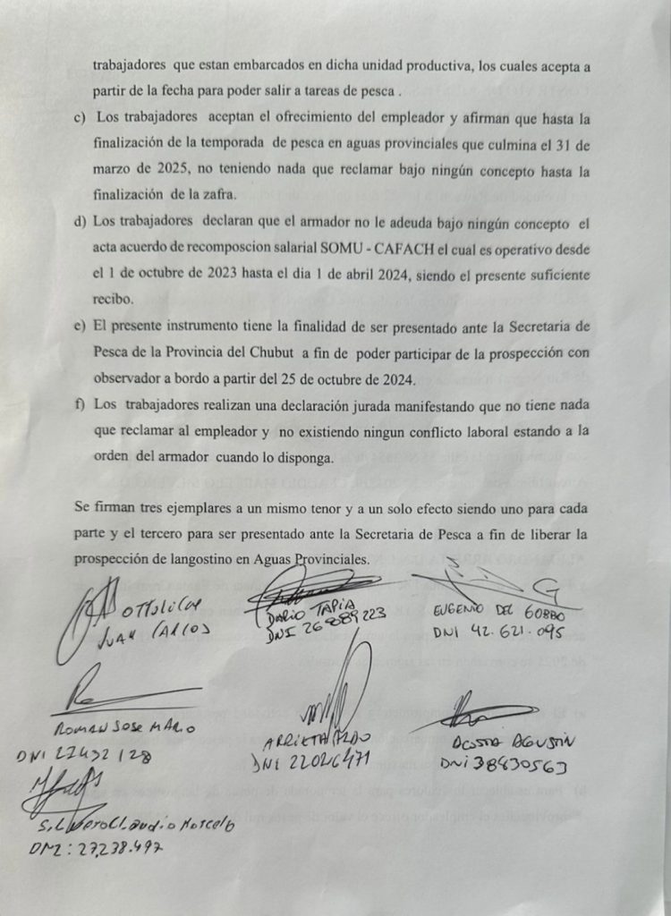 El acuerdo incluye una declaración jurada de los trabajadores, donde manifiestan que no tienen reclamaciones pendientes y se ponen a disposición del armador. Esta cláusula ha sido especialmente criticada por los marineros de Rawson, quienes sienten que se están despojando de sus derechos en favor de un acuerdo que no refleja las condiciones laborales justas.