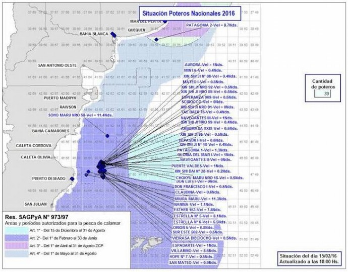 La temporada 2016 de calamar tiene por el momento a 39 poteros operando, de acuerdo al reporte que entregó la Subsecretaría de Pesca de la Nación. La mayor parte de la flota se concentra al norte de Puerto Deseado.