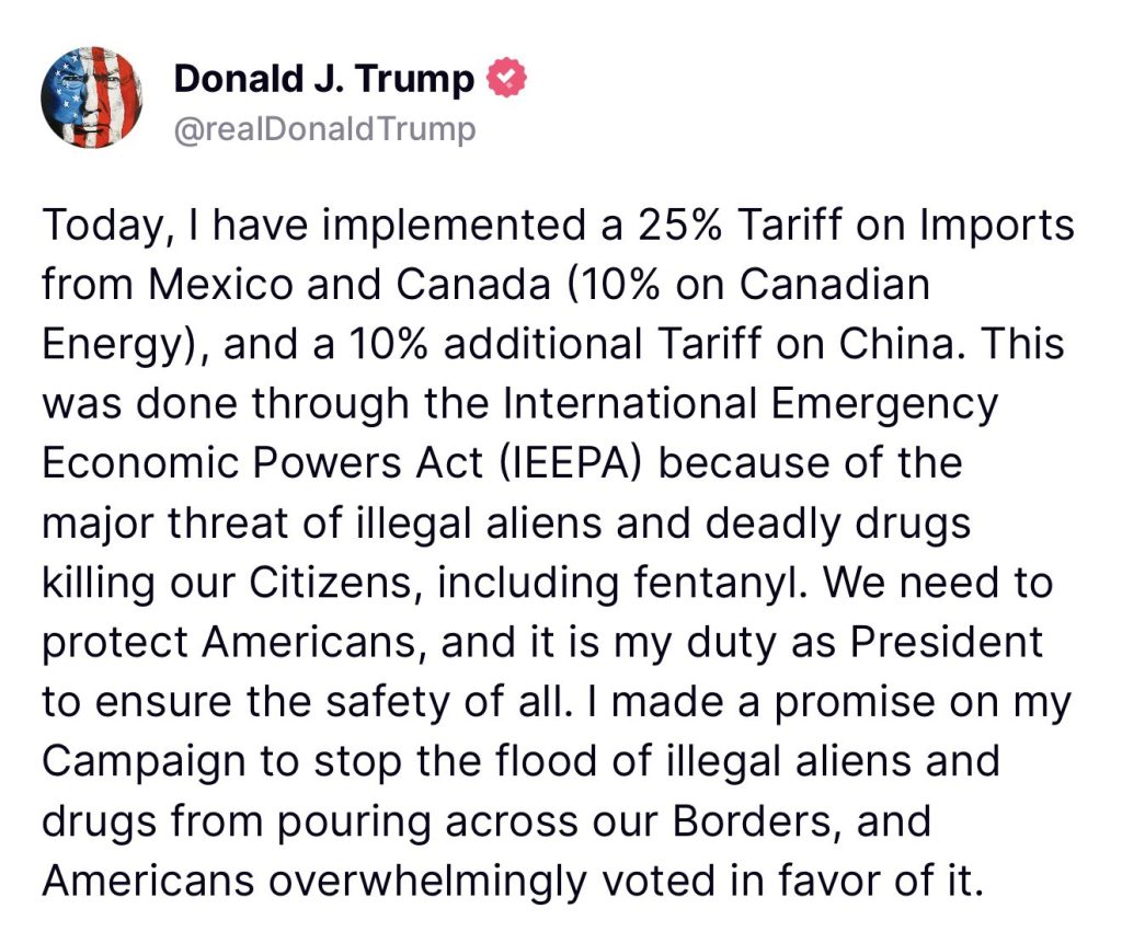 Trump oficializa de esta manera la guerra comercial, decretando los aranceles a importaciones de México, Canadá y China en una emergencia económica para imponer aranceles del 10% a todas las importaciones procedentes de China y del 25% a las procedentes de México y Canadá, los mayores socios comerciales de Estados Unidos, aunque cuando los mercados mostraron caídas violentas, flexibiliza a México dentro de las pretensiones originales.