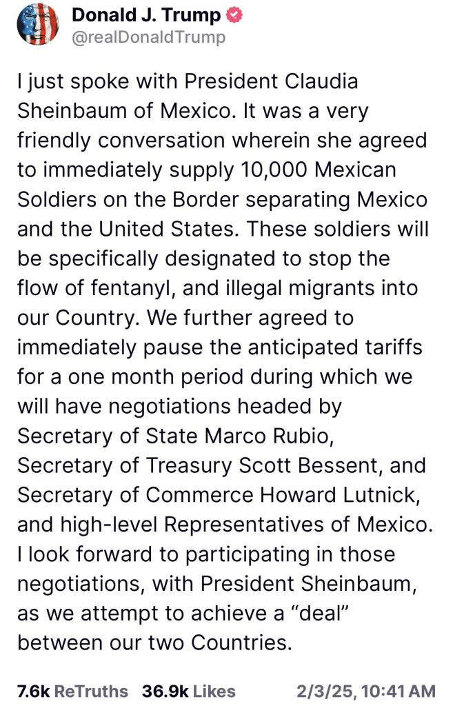 En una declaración vertida en su plataforma de la red social X, Trump suspendió temporalmente los aranceles del 25 por ciento previstos para México, luego de una conversación con la presidenta mexicana, Claudia Sheinbaum, en la cual se acordó el despliegue de 10.000 soldados mexicanos a la frontera norte con el objetivo de frenar el flujo de fentanilo y migrantes ilegales.