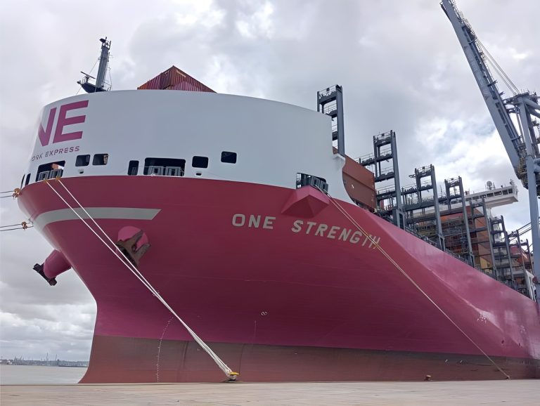 El protagonista de este evento es el ONE Strength, un coloso de la categoría Neo Panamax, bajo bandera de Singapur y operado por Ocean Network Express Latin America. En el marco de su viaje inaugural, iniciado en septiembre, la nave atracó en la terminal de Katoen Natie, donde permaneció menos de 24 horas, tiempo suficiente para reabastecer combustibles, agua y movilizar contenedores antes de continuar su travesía regional.