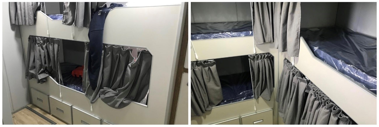 Camarotes divididos con cuatro camas y dos camas de acuerdo a la jerarquía, donde cada uno de los lechos poseen colchones de alta densidad, con luces individuales en cada una de las cabeceras y con pequeños grandes detalles como tomacorrientes al alcance de la mano, además de cómodas taquillas, cofres y bauleras para cada uno de los ocupantes.