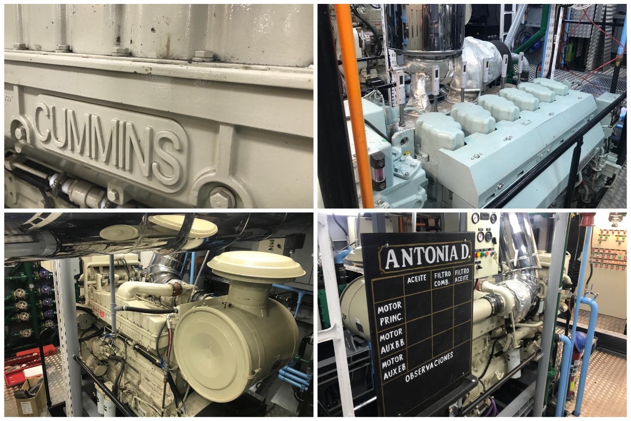 El motor principal, aun templado después de tenerlo en marcha para colaborar con maniobras de calibrado en cubierta y los 2 motores Cummins auxiliares completan una sala de máquinas superlativa.