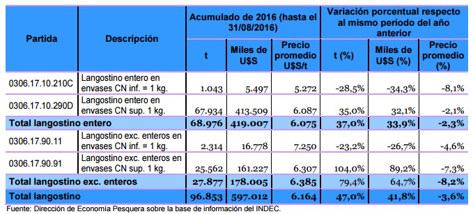 El reflejo de esta abundancia del crustáceo aparece en los datos que miden las exportaciones del sector. Hasta septiembre se habían exportado 96.853 toneladas de langostino por 597 millones de dólares, aunque con una caída en los precios del 3,6 por ciento.
