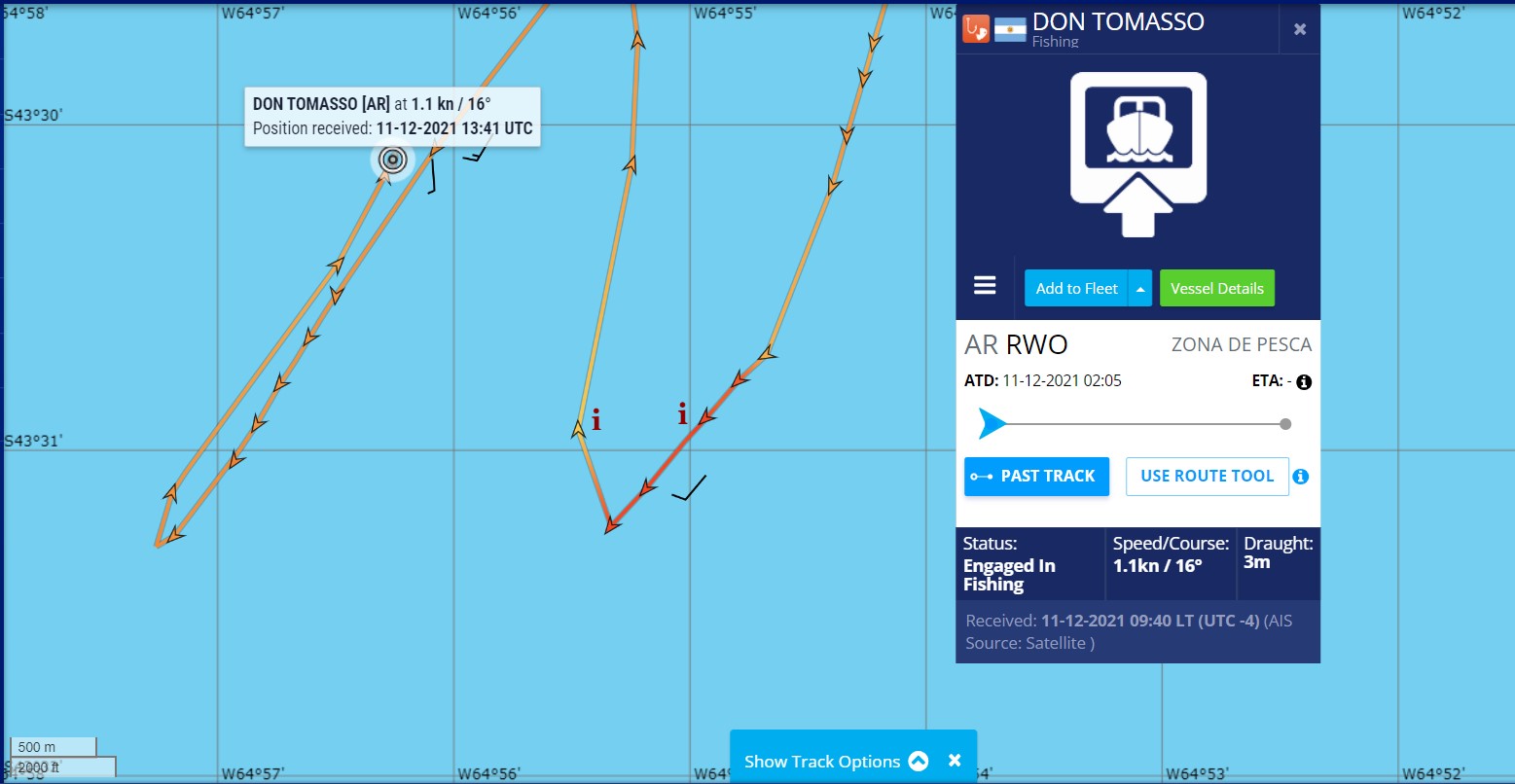 Por motivos que se intentan investigar, el BP Don Tomasso afectado a la pesca de langostino en aguas jurisdiccionales de Chubut, deja de emitir señal de AIS.