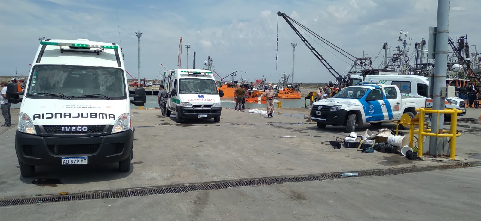 Pasado el mediodia, personal de ambulancias ingresa al puerto de Rawson, mientras el resto de los pesqueros, vuelve con sus barcos por decretarse luto dentro de la comunidad pesquera de ese puerto. Acompañamos a sus familiares y amigos en este momento difícil.