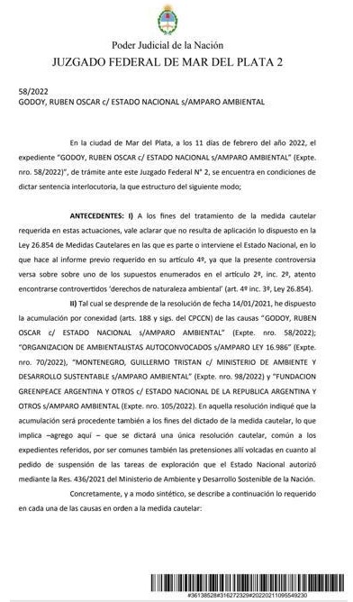 El Dr. Santiago Martín, titular del Juzgado Federal nro. 2, quien había unificado todas las presentaciones realizadas –la del Dr. Montenegro, ambientalistas y un particular- en contra de la exploración offshore, finalmente determinó hacer lugar para que se detengan las tareas de exploración offshore, al menos hasta que esté resuelta la cuestión de fondo.